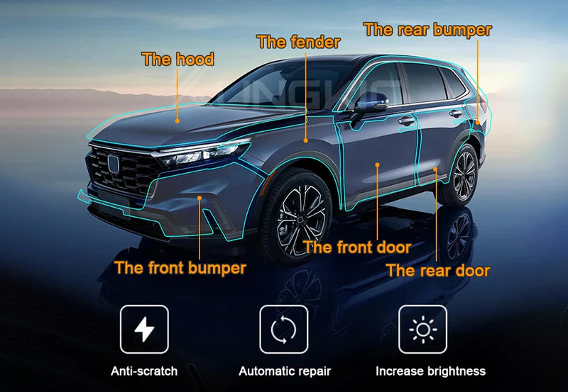 The Purple TPU Paint Protection Film combines modern aesthetics with reliable performance. Its soft purple color gives it a unique and high-end appearance and protects paint against stone chips, debris, and UV rays. It is made of strong but flexible TPU that can easily conform to flat and rounded surfaces. The self-repairing coating secures the disappearance of scratches under heat or the sun to preserve a clean finish. Installation can be trapped bubble-free and repositioned with pressure-sensitive adhesive and air-release channels, suitable for full wraps, partial coverage, accents, and detailing.